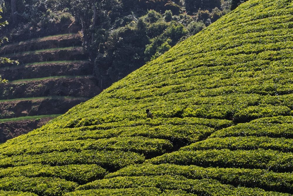Indien ist mehr als Staub, Hitze und Tempel. Weiter von der Küste entfernt, im Süden, liegen die Hügel. Diese sind so hoch, dass es dort kühler und klarer ist. Grund für die Briten in der Kolonialzeit, in den heißen Sommermonaten dorthin zu fahren. Auch heute noch sind sie beliebte Urlaubsorte. Auch Tee wird dort angebaut. Kamm um Kamm ist dunkelgrün gefärbt von den Teesträuchern, die in langen kreisförmigen Reihen bis zu den Gipfeln wachsen, mit Wegen dazwischen für die Frauen und Männer, die die Blätter ernten. alles zusammen ist ein Kunstwerk, das aufgrund seiner Form einen fast meditativen Charakter annimmt. dies zu porträtieren ist eine Übung in Form, um sicherzustellen, dass die Atmosphäre dieser besonderen Landschaft eingefangen wird.