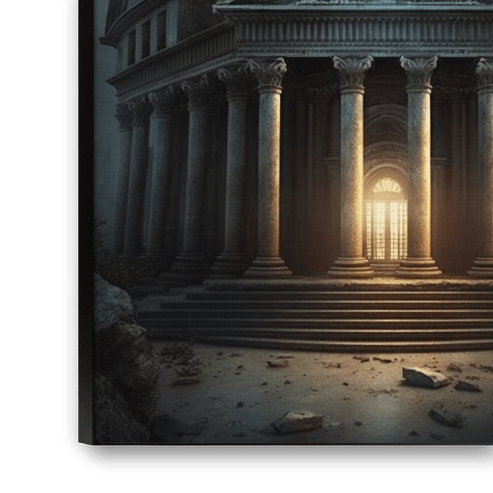 „Tempel der vergessenen Zeit“ fängt die Ehrfurcht einflößende Präsenz eines alten, kuppelförmigen Tempels unter einem stimmungsvollen, wolkenverhangenen Himmel ein. Hoch aufragende Säulen und detaillierte Schnitzereien schmücken das Bauwerk, das von einer dramatischen Beleuchtung erhellt wird, die sein Geheimnis und seine Majestät noch unterstreicht. Die Szene erweckt ein starkes Gefühl von historischer Erhabenheit und ist ideal für Sammler und Bewunderer klassischer Architektur und stimmungsvoller Landschaften.