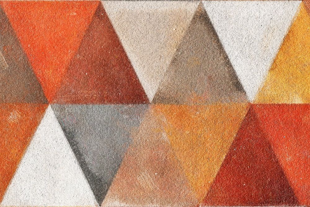 Dieses Werk besteht aus einem rhythmischen Muster von Dreiecken in tiefen Rosttönen, sanftem Orange, warmem Ocker und steinigem Grau. Die Wiederholung verleiht Ruhe, während die subtilen Farbunterschiede ein lebendiges Spiel erzeugen, das das Auge immer wieder aufs Neue fesselt. Das Ganze wirkt harmonisch und doch verspielt und fügt sich mühelos in ein modernes Interieur oder einen ruhigen Arbeitsbereich ein.