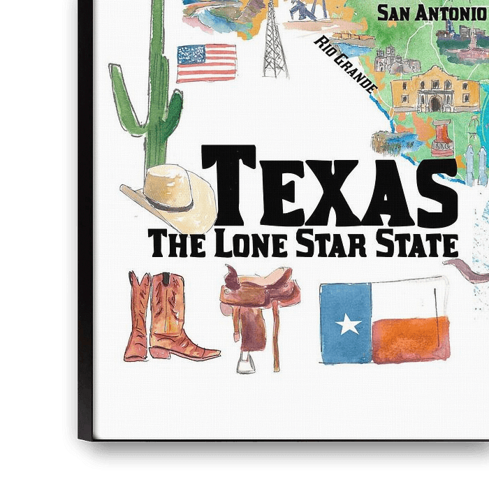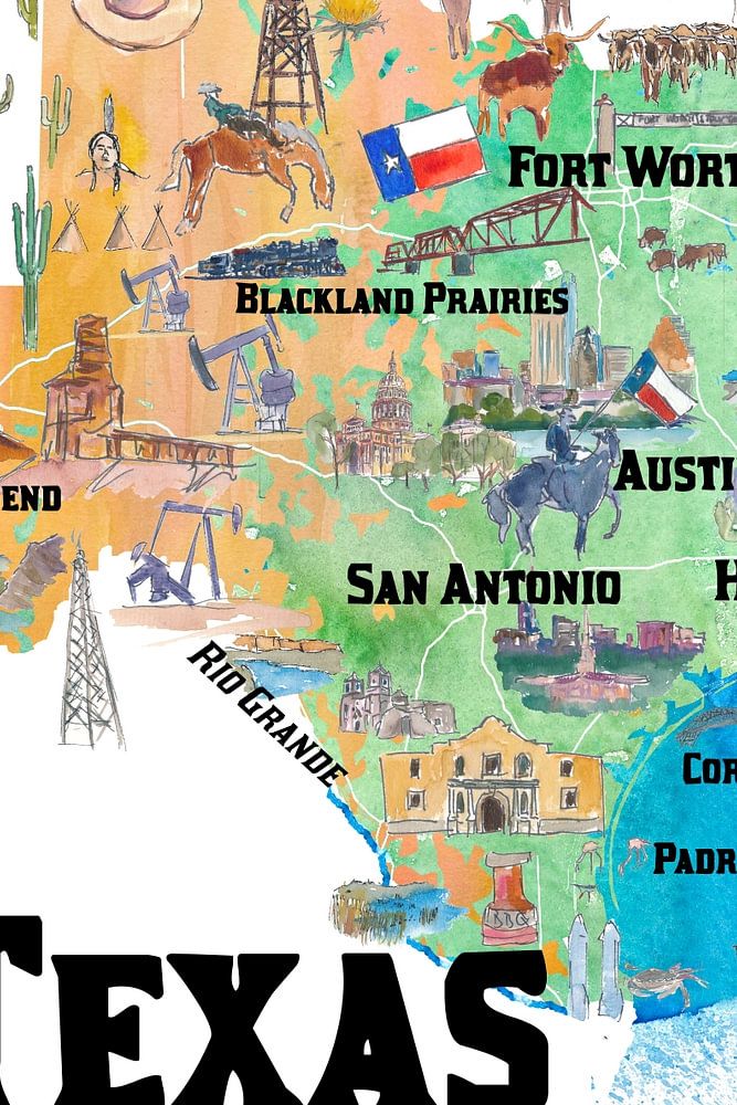 Texas State USA Illustrated Travel Poster Günstige Karte mit Straßen und touristischen Highlights