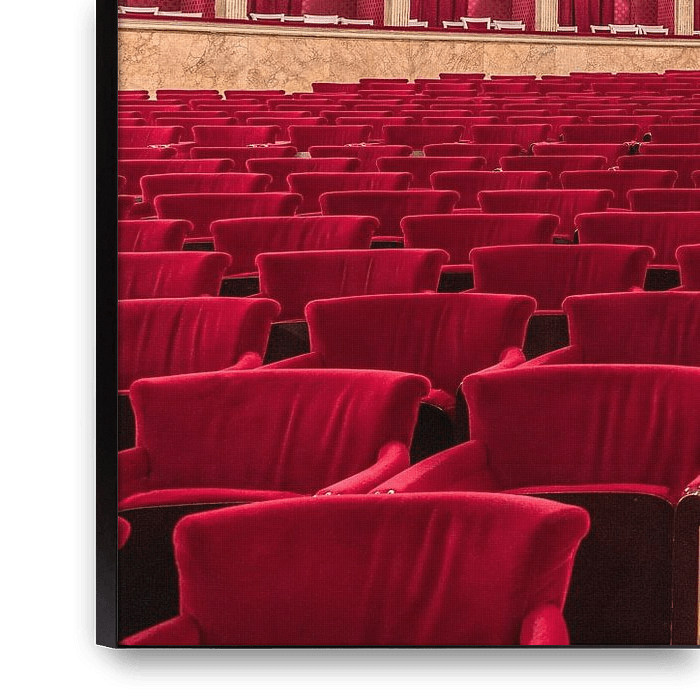 Ein Theatersaal ohne Publikum. Das Bild wurde genau in der Mitte aufgenommen, so dass Sie eine schöne Symmetrie zwischen links und rechts der Mitte erkennen können.