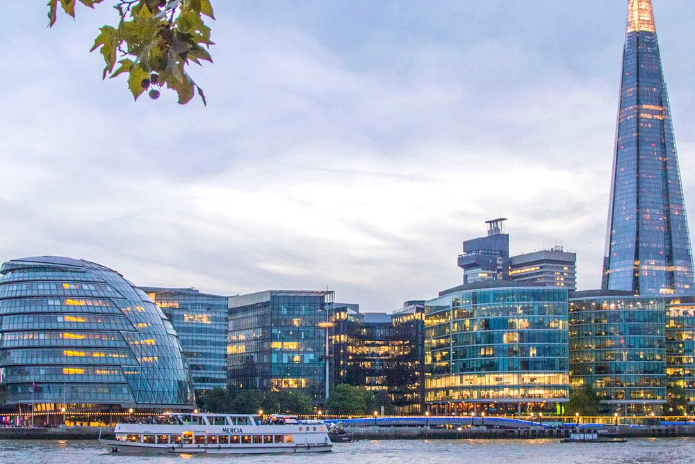 Gebäude in London (bei Nacht) mit der Themse im Vordergrund.