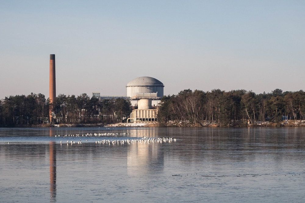 Ein See bei einer Industrie, komplett zugefroren. Vögel auf dem Wasser.