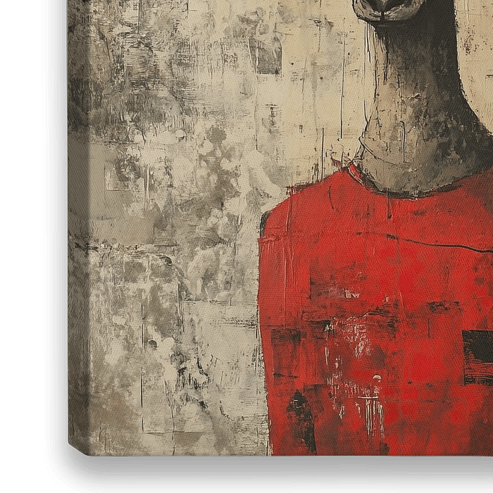 Animal in Red - Dieses abstrakte Tierbild zeigt ein Reh mit menschlichem Körper, das einen leuchtend roten Pullover vor einem verwaschenen, geschichteten Hintergrund in Beige- und Grautönen trägt.