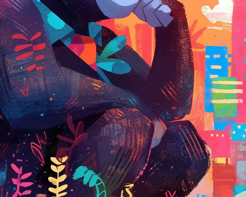 Tierbild - Dieses abstrakte Tierbild zeigt einen denkenden Gorilla, der inmitten bunter, stilisierter Stadt- und Naturszenen sitzt, wobei der orangefarbene Hintergrund und blaue Elemente dominieren.