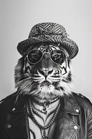Ein Porträt eines Tigers stilvoll bekleidet mit einer Schiebermütze und großen Sonnenbrillen, in elegantem Schwarz-Weiß. Modern und künstlerisch.