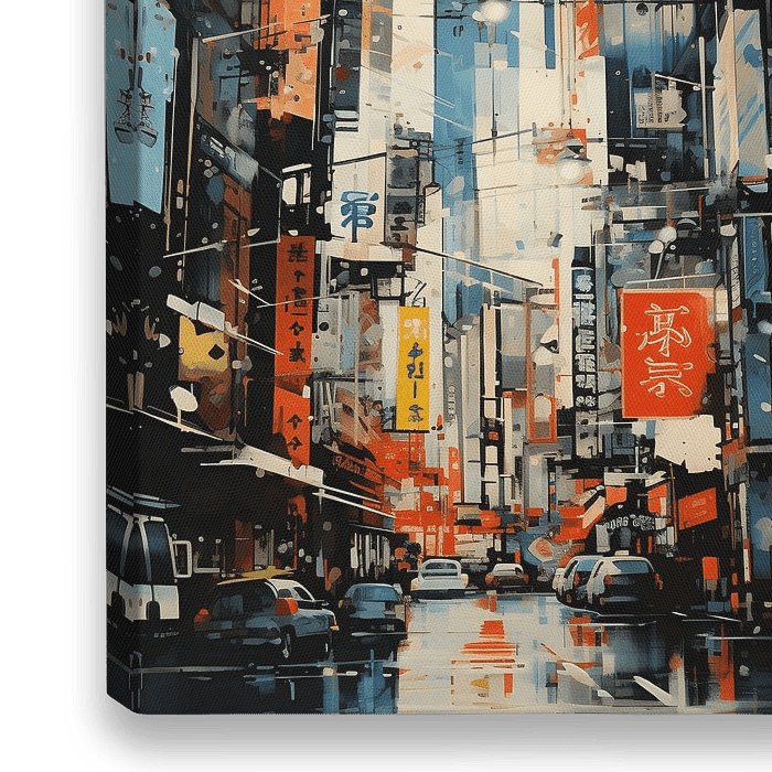 Eine farbenfrohe, lebendige und abstrakte Darstellung eines Straßenzugs in Tokyo. Ein Eindruck von der chaotischen Schönheit dieser japanischen Großstadt.