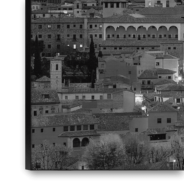 Ein Schwarz-Weiß-Foto eines Abends in Toledo mit Blick vom berühmten Aussichtspunkt "Mirador Panoramico" auf den Alcazar von Toledo, eine steinerne Festung auf dem höchsten Punkt dieser spanischen Stadt.