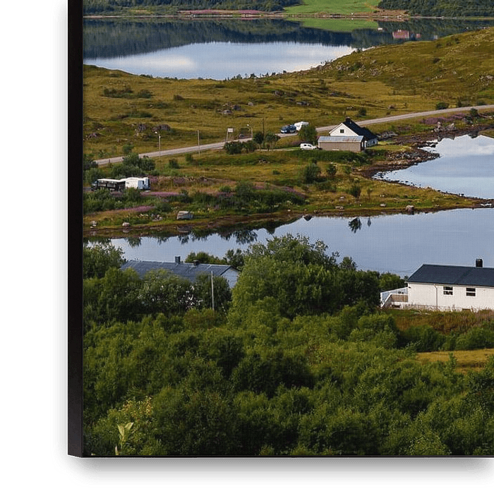 Blick auf eine weite Landschaft vom Pass Torvdalshalsen auf den Lofoten in Norwegen. An einem sonnigen Tag blicken wir auf eine Kirche, ein kleines Dorf und das ruhige Wasser eines kleinen Sees, in dem sich die fernen Berge wunderbar spiegeln.