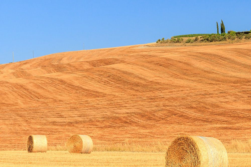 Prachtig typisch Toscaans gouden landschap met hooibalen en een landhuis in de zomer