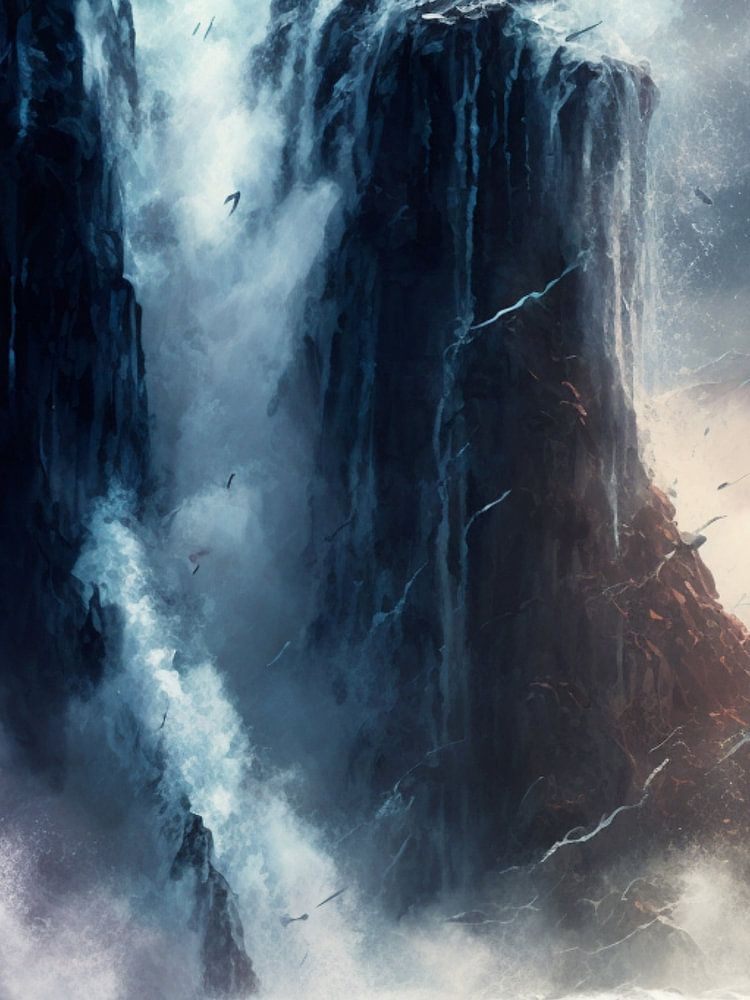 Die dramatische Szene fängt die rohe Kraft eines tosenden Wasserfalls ein, der sich von dunklen, zerklüfteten Klippen in einen stürmischen Ozean stürzt. Gischt und Nebel steigen auf, während das Wasser mit immenser Energie auf die Felsen am Ufer trifft und türkisfarbene Wellen aufpeitscht. Blitze zucken am düsteren Himmel und unterstreichen die unheilvolle Atmosphäre. Einzelne Vögel kämpfen gegen die Elemente. Die Komposition vermittelt ein Gefühl von Naturgewalt und Erhabenheit.