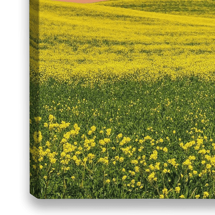 Toskanische Landschaft mit Raps im Vordergrund.