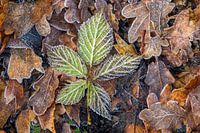 Abgefallenen Blätter einer Brombeere. Der Blattrand ist mit Eiskristallen bedeckt. Tote Blätter nach dem Frost.
