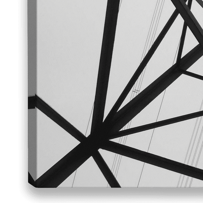 Abstraktes in Schwarzweiss. Diagonalen und feine Strukturen am Hochspannungsmast.