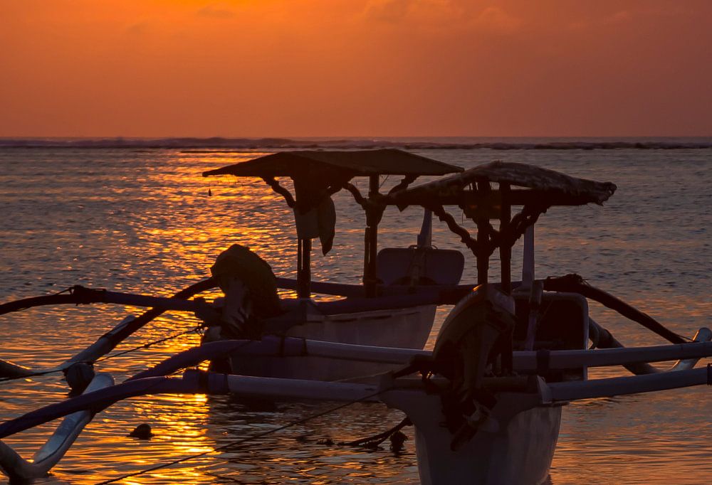 Traditionelle balinesische Boote (Jukung) bei Sonnenuntergang in Bali, Indonesien