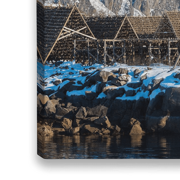 Bestelle das Foto Traditionelles Holzgerüst zum Trocknen von Fisch auf den Lofoten Inseln im Winter mit Bergen und Sch von Robert Ruidl als Reproduktion auf Leinwand, Alu-Dibond, als Poster, Fototapete oder Acrylglasbild.