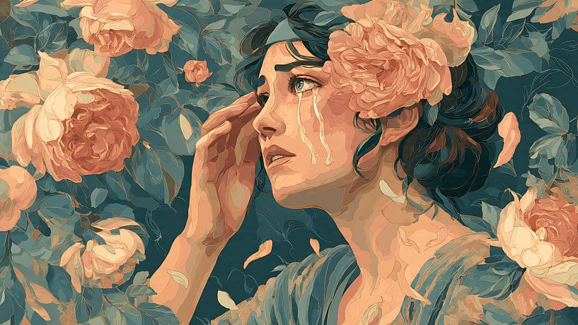 Eine surreale digitale Kunstillustration einer weinenden Frau, deren Tränen sich in blühende Rosen verwandeln, die aus ihrem Kopf sprießen. Dieses skurrile Kunstwerk im Stil eines Ölgemäldes zeichnet sich durch malerische Pinselstriche, gedeckte Vintage-Farben und eine traumhafte flache Komposition aus. Perfekt für Liebhaber von…