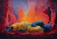 Eine surreale Komposition zeigt eine Gestalt mit blauer Haut, gehüllt in goldenes Gewand, liegend zwischen feurigen roten Felsformationen. Der leuchtende Hintergrund ruft Wärme und Geheimnis hervor und verwischt die Grenze zwischen Traum und Realität.