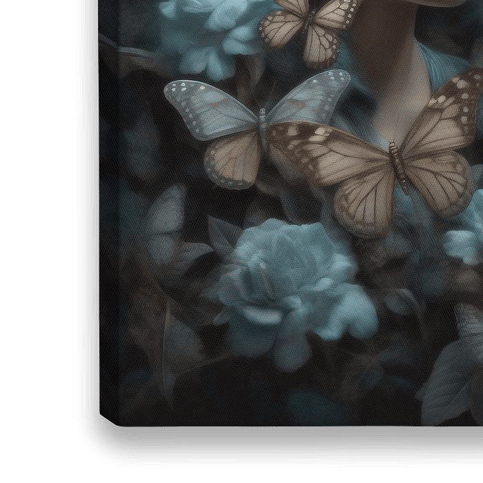 Fantasievolles Porträt eines verträumten Mädchens mit Schmetterlingen in hauptsächlich blauen, grauen und beigen Tönen.