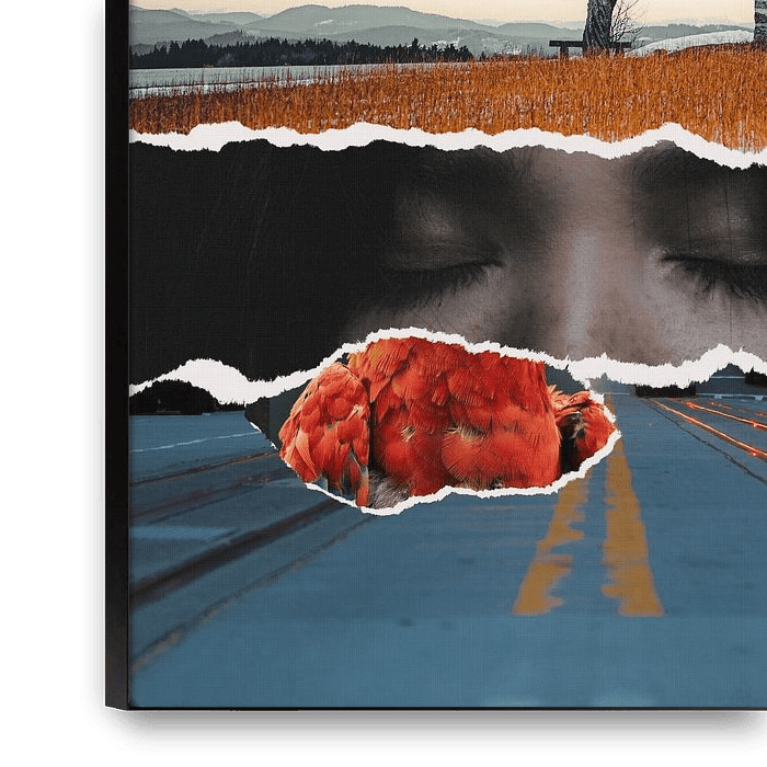 Fröhliche Collage mit bunten Luftballons und Landschaft. Eine absurde und surrealistische Collage, die glücklich macht. Das Porträt der Frau mit geschlossenen Augen ist ein geheimnisvoller Teil. Der Papagei und die Luftballons in Rot, Orange und Rosa machen es zu einem fröhlichen Ganzen. Die Straße färbt den blauen Himmel und macht ihn…