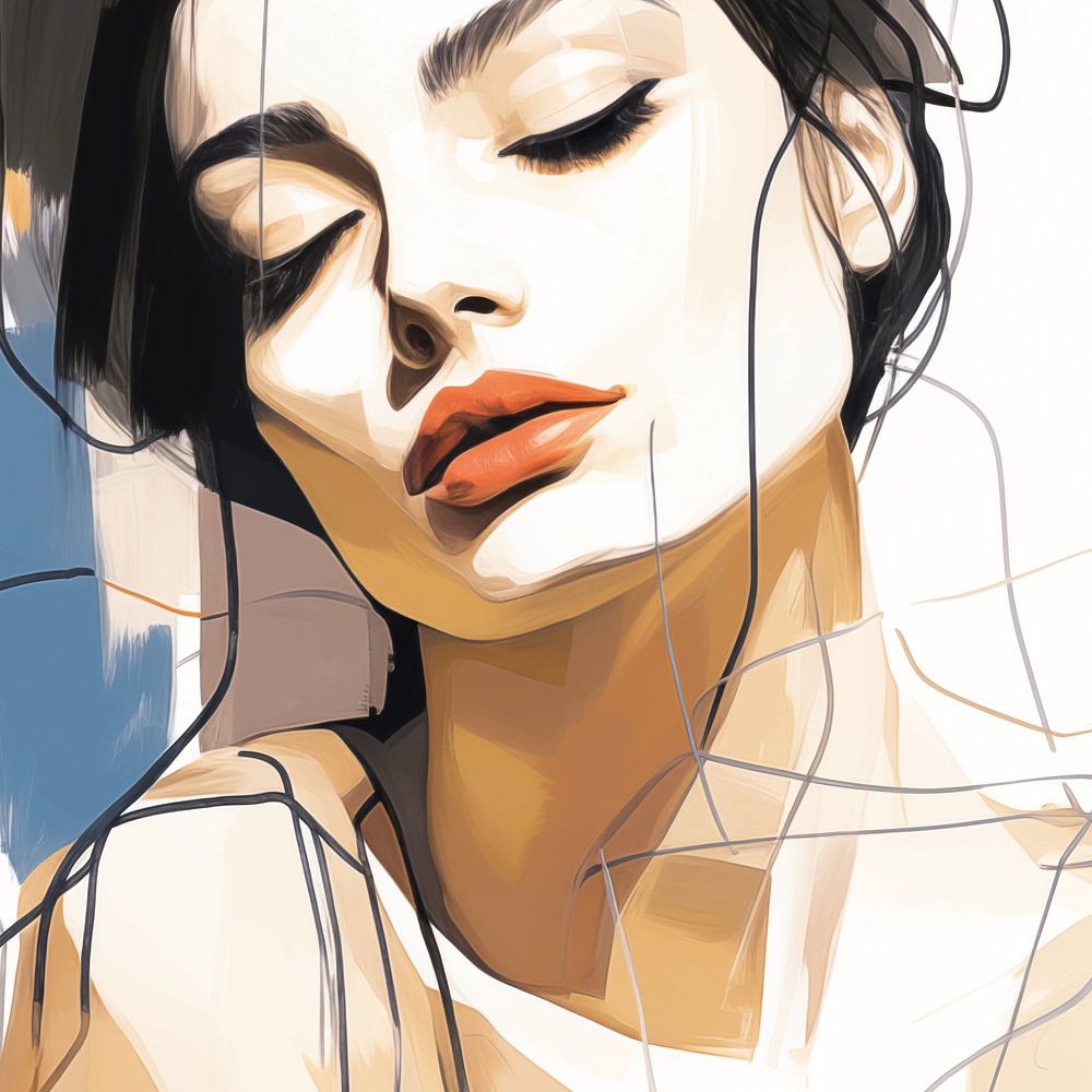 Die abstrakten Elemente und Linien um das Gesicht wirken fast wie eine Aura, die ein Gefühl von Bewegung und emotionaler Komplexität vermittelt. Die Technik erinnert an ein digitales Medium, wobei die Pinselstriche sowohl Präzision als auch Spontaneität ausstrahlen.