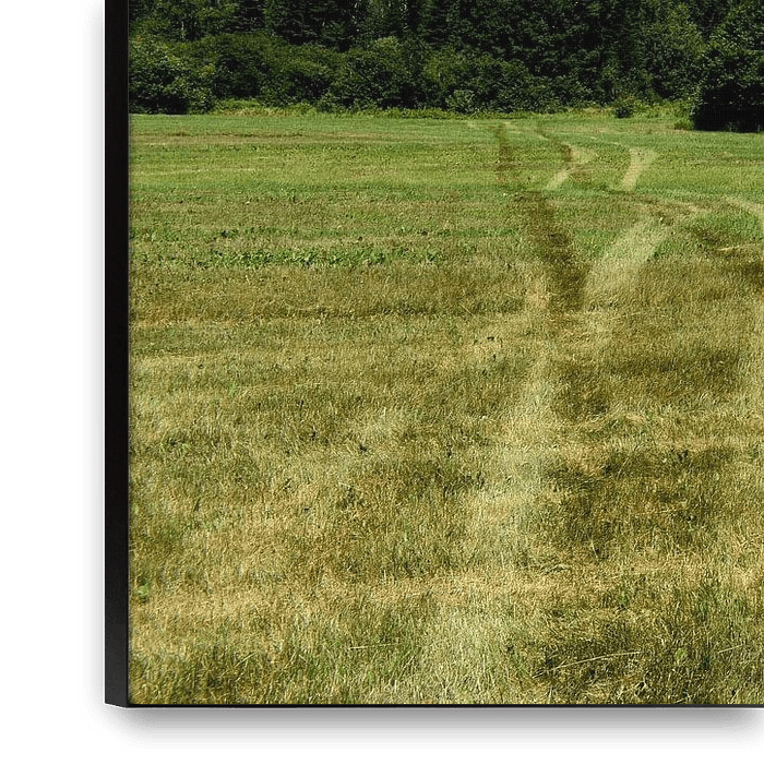 Bestelle das Foto Traktorspuren auf einem Feld im Sommer von Claude Laprise als Reproduktion auf Leinwand, Alu-Dibond, als Poster, Fototapete oder Acrylglasbild.