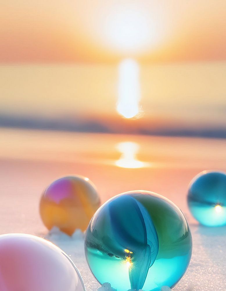 Tauchen Sie ein in die Magie des Sonnenuntergangs mit diesem bezaubernden Print. Auf dem Bild sehen Sie funkelnde Murmeln, die auf weißem Sand am Strand liegen, während die Sonne am Horizont untergeht und das Meer in ein goldenes Licht taucht. Diese verträumte Szene strahlt Ruhe und Frieden aus und fängt die Schönheit eines perfekten Augenblicks in der Natur ein.