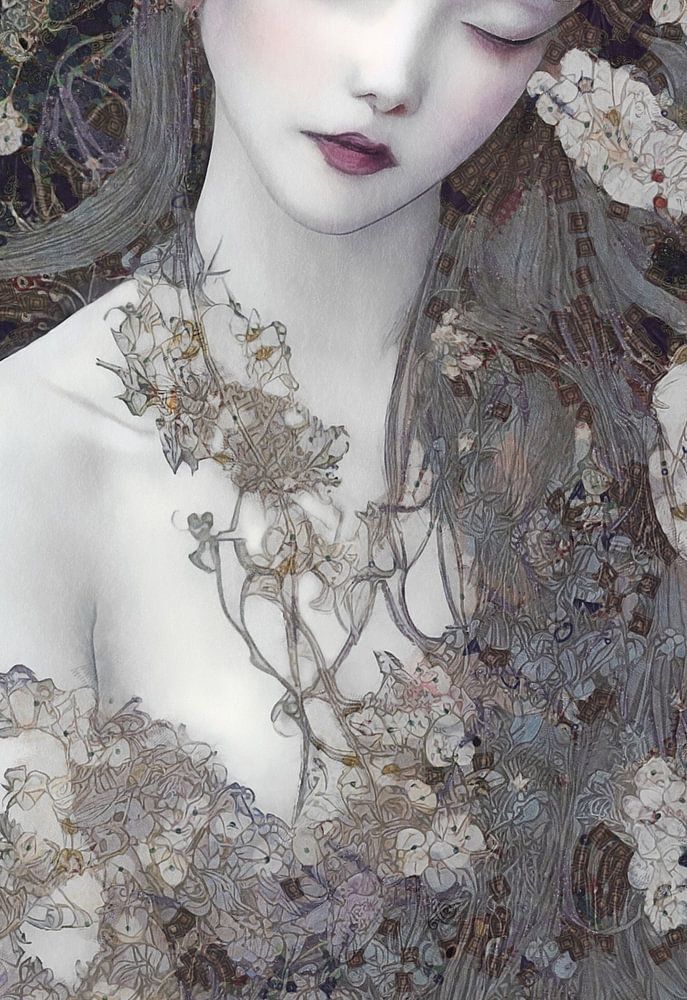 Vintage-Fantasie-Porträt eines Mädchens mit Blumen, Mixed-Media-Illustration mit einem verträumten, romantischen Gefühl in hauptsächlich lila, braun, rosa und grauen Tönen.