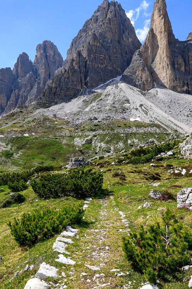 Weg zu den Drei Zinnen in den Dolomiten im Frühling in Venetien, Italien