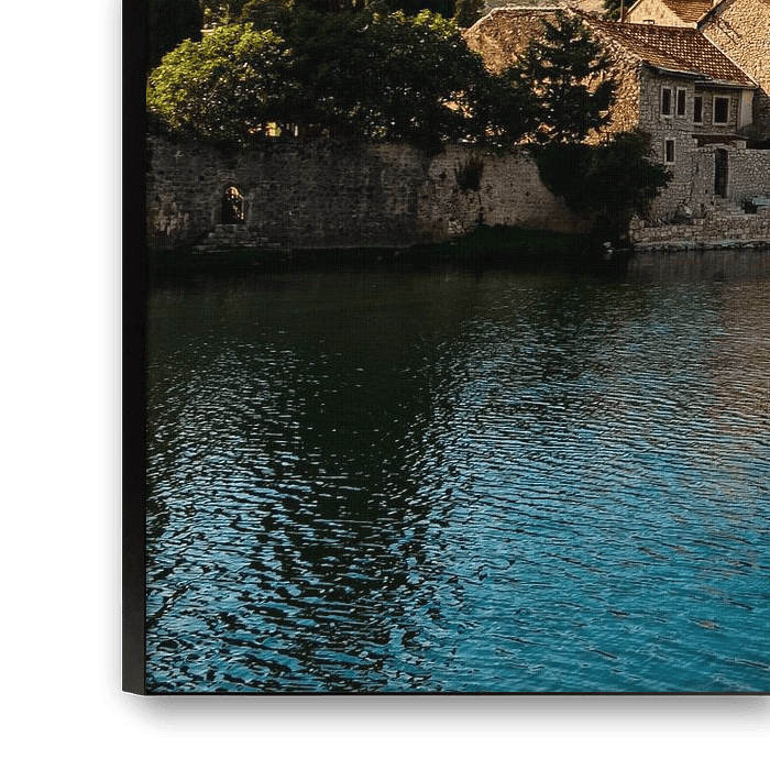 Die Stadt Trebinje in Bosnien und Herzegowina mit ihrer schönen Brücke über das Wasser und den kultigen Häusern am Wasser.
