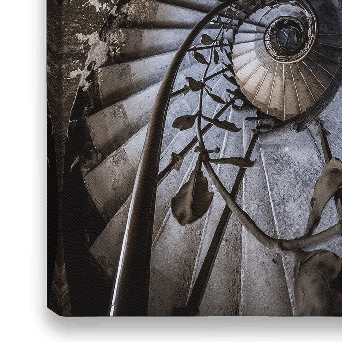 Bestelle dieses abstrakte Wandbild Treppe mit Spirale und Dekorationen von Inge van den Brande als Reproduktion auf Leinwand, Alu-Dibond, als Poster, Fototapete oder Acrylglasbild.