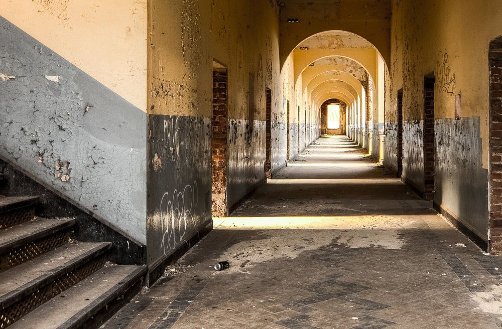 Treppe und Flur in einem alten Gefängnis irgendwo in Belgien.