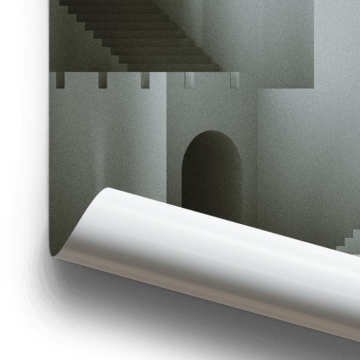 Ein surreales Bild einer imaginären Stadtlandschaft aus grauen Treppen und Tunneln.