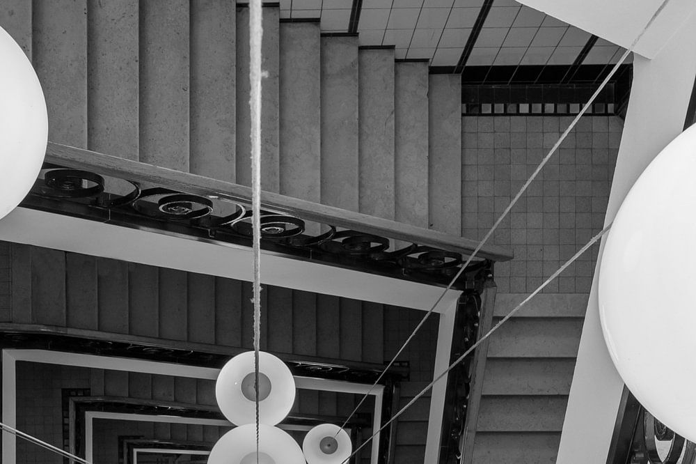 Das Oxford House am Nieuwezijds Voorburgwal in Amsterdam hat ein schönes Treppenhaus. Auffallend ist auch die Beleuchtung mit verschiedenen milchfarbenen Lampen, die vom Dach bis zum Erdgeschoss reichen und ein fotogenes Bild ergeben.