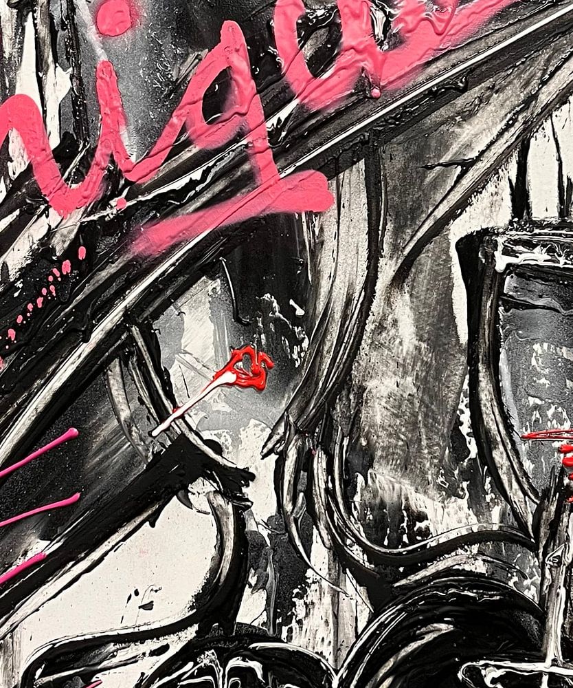 In einem bezaubernden Zusammenspiel von Schwarz, Weiß und zarten rosa Akzenten fängt dieses Gemälde das Wesen einer geheimnisvollen und starken Frau ein. Ihr schicker Hut bietet ihr einen gewissen Schutz, aber gleichzeitig strahlt sie eine versteckte Verletzlichkeit aus. Mit einem dynamischen Wisch wischt sie sich den Lippenstift von den Lippen, die in leuchtendem Rot den Mittelpunkt ihres Gesichts bilden. In der Hand hält sie lässig ein Glas Wein, das Raffinesse und Entspannung zugleich symbolisiert. Der Titel "Tres Chique" verkörpert die elegante und komplexe Schönheit dieser Frau, wobei jedes Element zu einer tieferen Bedeutung und Verführung beiträgt.