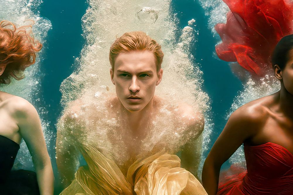 Die aufsteigenden Luftblasen hinter ihnen formen eine Art Energiekegel, ein visuelles Echo des Eintauchens. Es ist kein Sprung aus Angst, sondern ein Übergang in eine andere Realität. Die Intensität in den Blicken, die gespannte Körperhaltung, das dramatische Spiel aus Stoffen und Wasser – all das erschafft ein Bild von Entschlossenheit und ritueller Bedeutung.