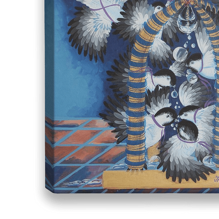 Bestelle dieses Vögel Wandbild Tröpfchen Chickadees von Irina Corduban als Reproduktion auf Leinwand, Alu-Dibond, als Poster, Fototapete, ArtFrame oder Acrylglasbild, maßgefertigt in höchster Qualität.