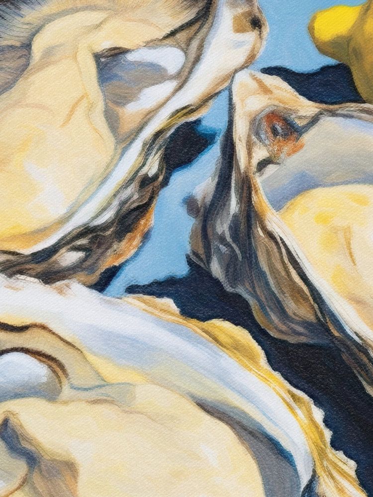 Drei Austern und eine Zitrone, auf einem blauen Hintergrund.