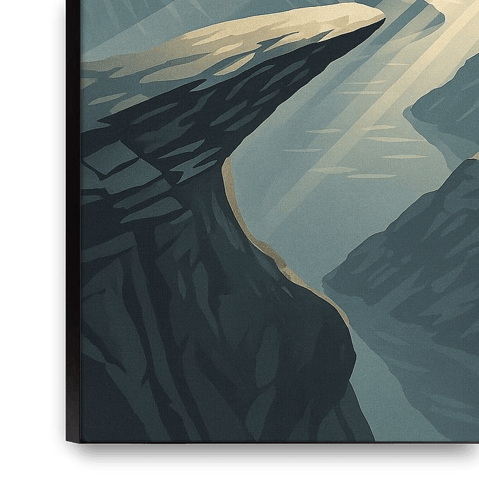Dieser Trolltunga-Kunstdruck aus Norwegen fängt die dramatische Schönheit eines der berühmtesten Aussichtspunkte Skandinaviens in einem zeitlosen Vintage-Poster-Stil ein. Hoch über einem Fjord ragt die Felsformation Trolltunga in den Himmel und bietet einen atemberaubenden Blick auf die umliegenden Berge und Täler. Das Kunstwerk…