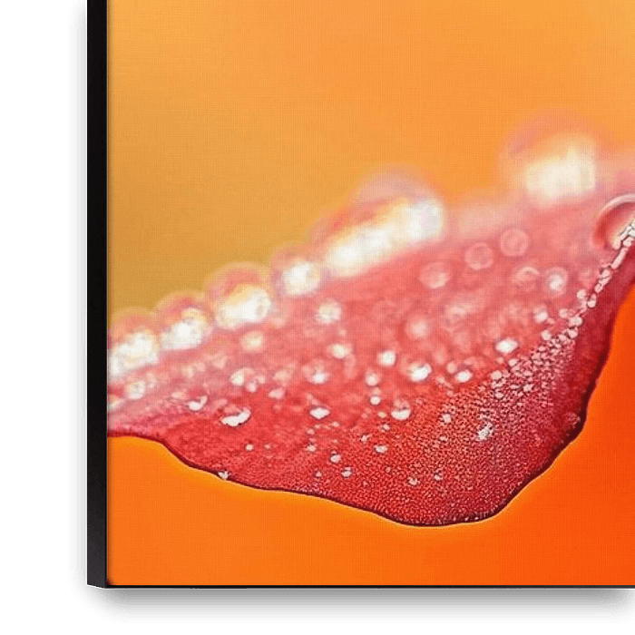 Mit seinen sanften, geschwungenen Linien und dem schimmernden Spiel von Wassertropfen fängt dieses florale Detail die zarte Schönheit einer Rose ein. Die warmen Rottöne und lebendigen Texturen verleihen jedem Raum eine einladende, romantische Atmosphäre – perfekt für das Schlafzimmer oder das Wohnzimmer, um behagliche Akzente zu setzen.