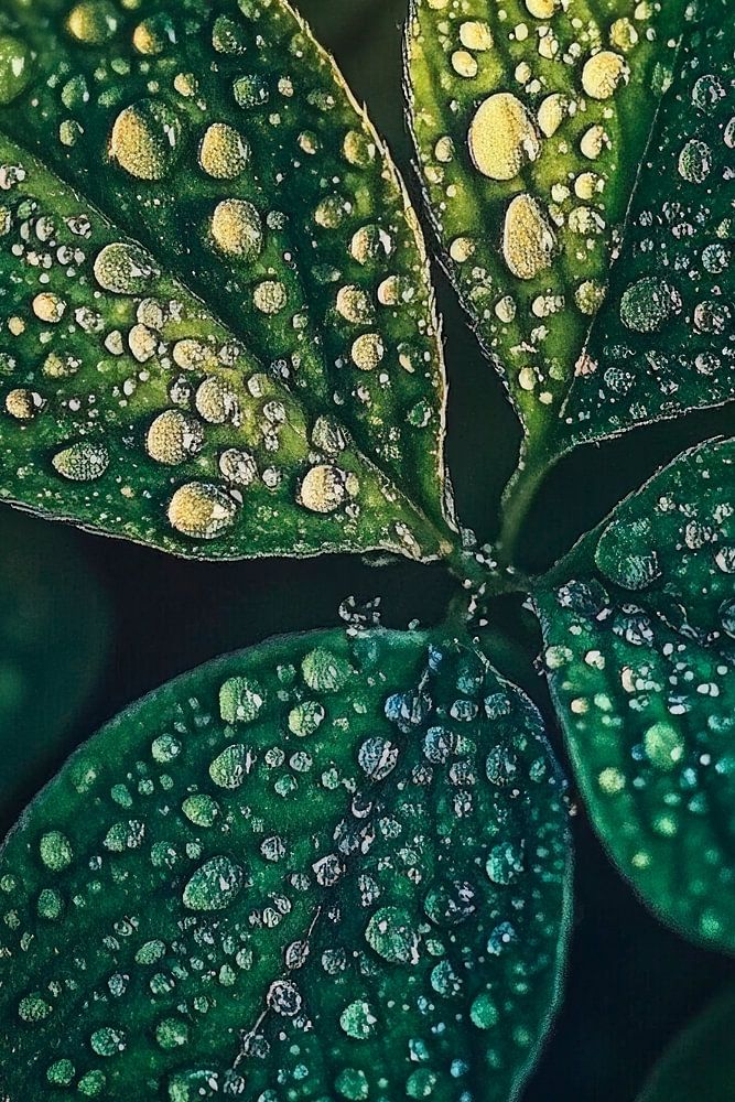 Ein faszinierendes Zusammenspiel von Natur und Licht zieht den Betrachter in seinen Bann. Die brillanten Wassertropfen tanzen auf den satten, grünen Blättern und verleihen dem Raum ein Gefühl von Frische und Lebendigkeit. Dieses Kunstwerk passt perfekt in eine Küche oder ein Wohnzimmer, wo es eine beruhigende Atmosphäre schafft und den Blick für die kleinen Wunder der Natur öffnet.