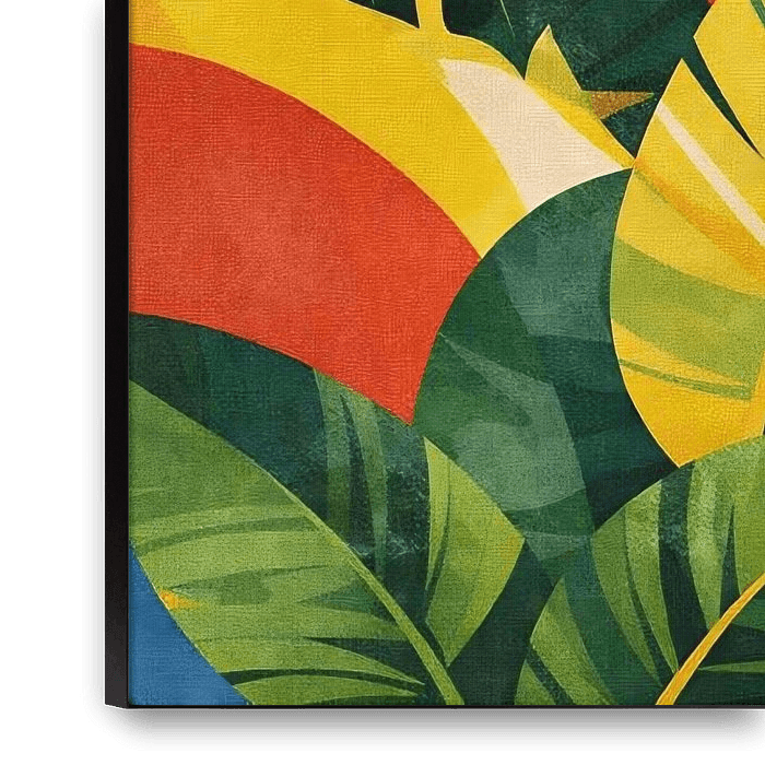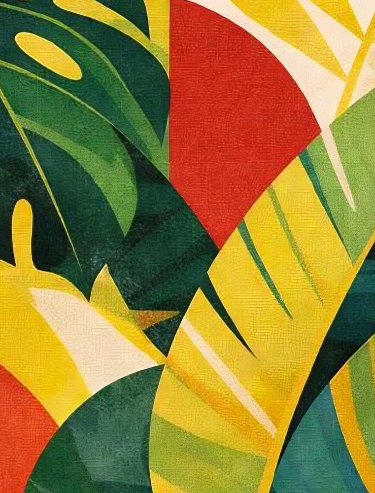 Dieses moderne abstrakte tropische Kunstwerk zeigt übereinanderliegende botanische Blätter in einer kühnen, harmonischen Komposition. Satte Grüntöne werden mit warmen Gelb-, Rot- und Blautönen kombiniert, was ein lebhaftes und dennoch ausgewogenes visuelles Erlebnis schafft. Das sich überlappende Blattwerk erinnert an die üppige…