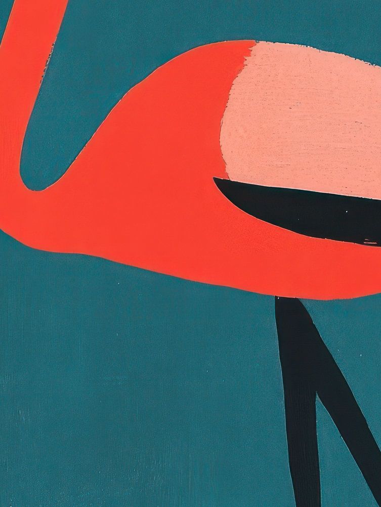 Dieses verspielte und grafische Kunstwerk zeigt einen stilisierten Flamingo in einer minimalistischen Komposition. Mit kräftigen, flächigen Farben in rötlichem Pink und Petrolblau und einer sanften pfirsichfarbenen Umrandung erhält der Vogel einen modernen Look mit einem Hauch von Retro. Das Stück strahlt Ruhe und Charakter aus - ideal für ein stilvolles Interieur, das Einfachheit mit Flair liebt. Perfekt für das Wohnzimmer, das Kinderzimmer oder das Büro.