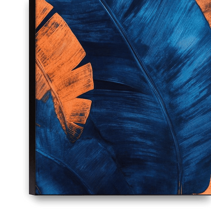 In einer harmonischen Symbiose aus tiefem Blau und leuchtendem Kupfer entfalten sich schwungvolle Blätter, die die Energie der Natur widerspiegeln. Die dynamischen Kurven und Texturen laden dazu ein, in eine exotische Welt einzutauchen, während das Zusammenspiel von Farbe und Form eine ruhige, doch lebendige Atmosphäre schafft.
