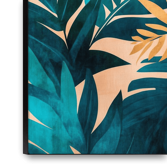 In einem harmonischen Spiel von tiefen Aquatönen und warmem Gold entfaltet sich ein botanisches Kunstwerk. Die kraftvollen, geschwungenen Blätter scheinen zu tanzen, während sie den Raum mit einem Hauch von tropischer Eleganz füllen. Diese lebendige Komposition weckt die Sinne und lädt zu einer Reise in exotische Gefilde ein.