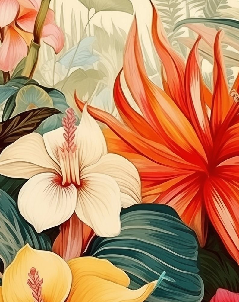 Ein tropisches Pflanzenarrangement auf einer alten Vintage-Papier-Illustration, die im Stil der farbenfrohen Pixelkunst gestaltet ist. Das Bild zeigt ein zartes Design aus Blumen und Gartenelementen, wobei kräftige Acrylfarben die Illustration zum Leben erwecken. Das Ganze erweckt die Atmosphäre eines lebendigen und detaillierten Kunstwerks, das sich als Tapete oder Illustration eignet.