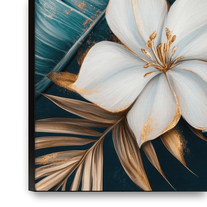 In einem faszinierenden Spiel von Farben und Texturen entfalten sich elegante, weiße Blüten mit goldenen Akzenten vor einem tiefblauen Hintergrund. Die üppigen, geschwungenen Blätter in sanften Grüntönen und die zarten, kleinen Blüten verleihen der Komposition eine harmonische Erfrischung, während goldene Elemente einen Hauch von Luxus…