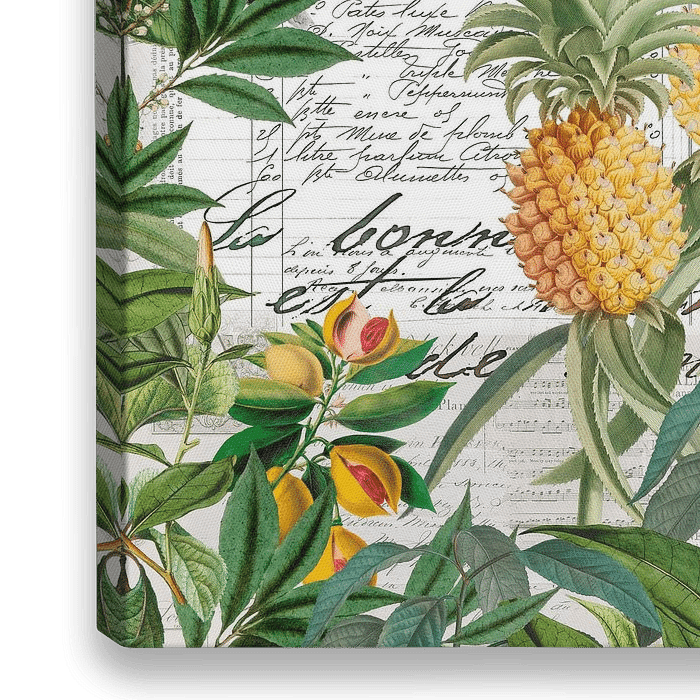 Illustration mit exotischen Früchten, Vögeln und üppig grünen Blättern, perfekter Sommer-Stil, schöne Vintage-Dekoration für Küche, Esszimmer oder Restaurant.