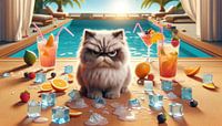 Ein wahrer Blickfang ist dieses Bild einer Perserkatze, die unbeeindruckt in der Mitte einer scheinbar perfekten Sommerkulisse sitzt. Umgeben von bunten Cocktails und frischen Früchten auf einer Poolterrasse scheint die Stimmung der Katze paradox zur lebensfrohen Umgebung zu stehen. Eiswürfel und Fruchtsäfte sind verschüttet, als…