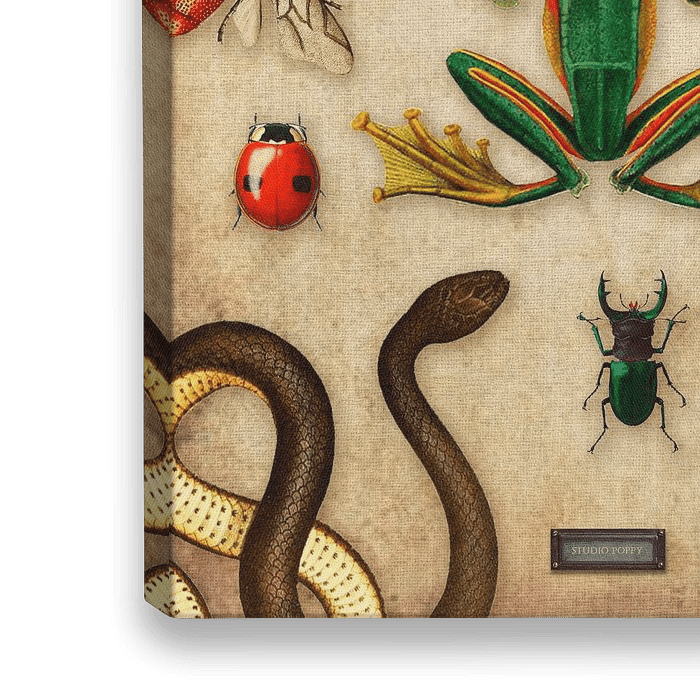 Bestelle diese Collage Tropische Wandtafel mit Reptilien und Insekten von Studio POPPY als Reproduktion auf Leinwand, Alu-Dibond, als Poster, Fototapete oder Acrylglasbild.